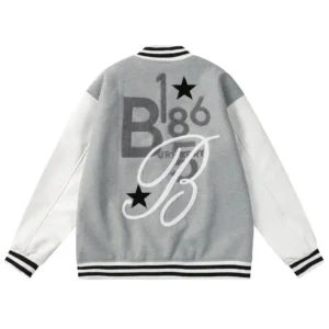 Burberry Leather Sleeve Technical Wool Varsity Jacket Grey White